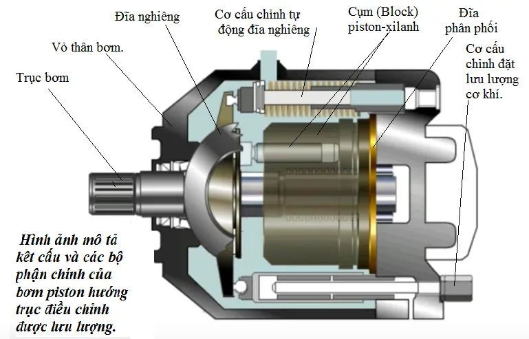 • Bộ phận cốt lõi: Bơm thủy lực bao gồm vỏ thân bơm, trục bơm, cụm piston-xilanh, đĩa phân phối và đĩa nghiêng.